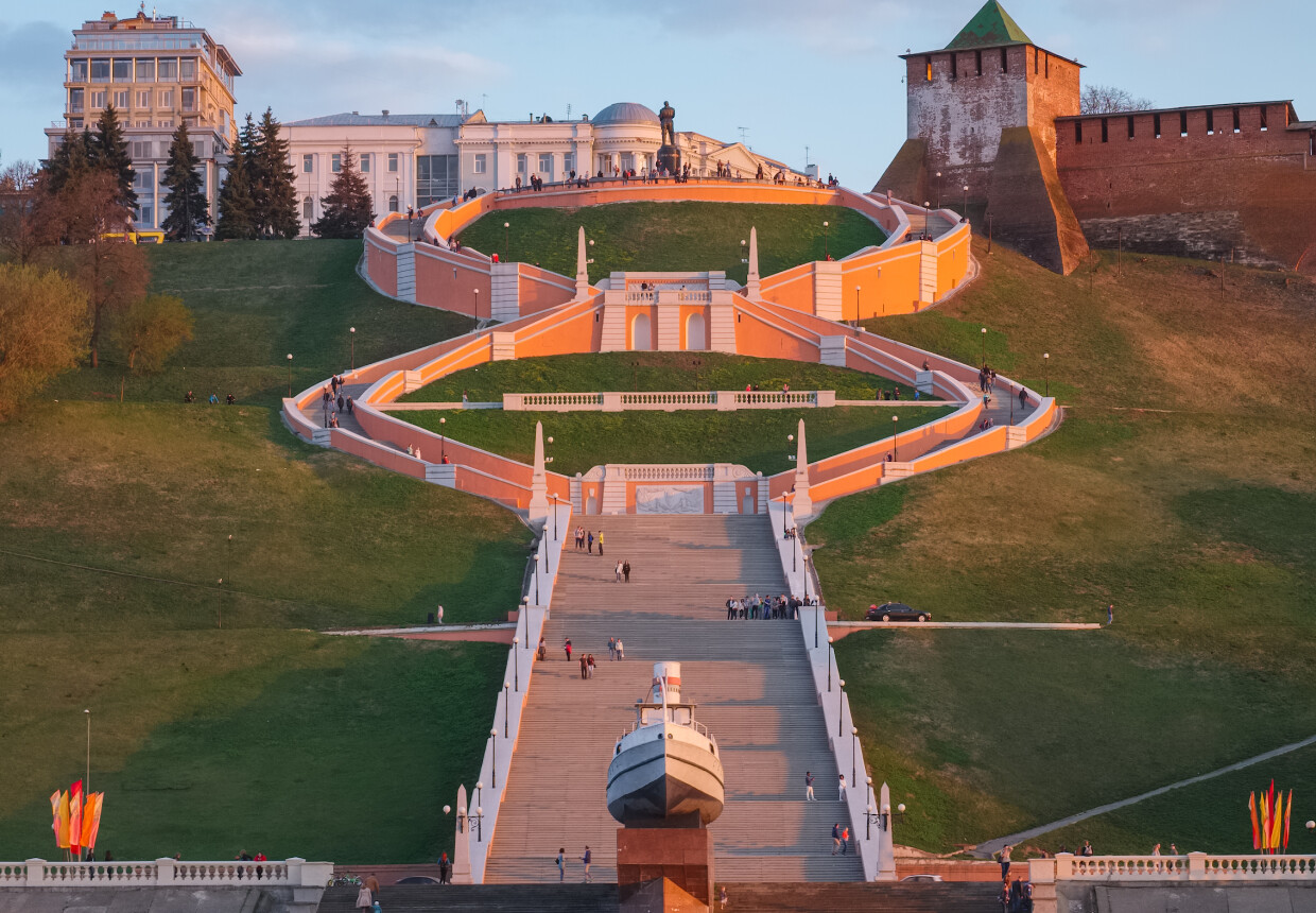 Вы увидите место, где сливаются две великие реки - Волга и Ока. Место их слияния называется "Стрелкой" и располагается прямо у подножья Дятловых гор, на которых и расположена историческая нагорная часть города. Горы имеют высоту 80 метров и создают прекрасную природную площадку для созерцания нижегородских пейзажей.