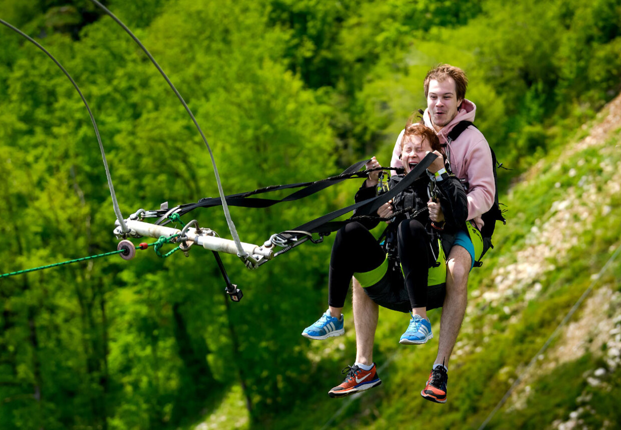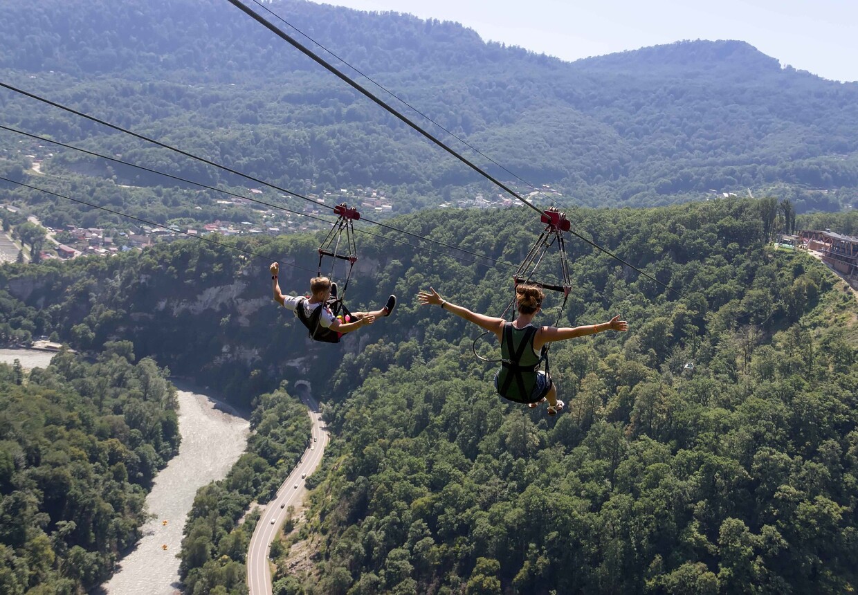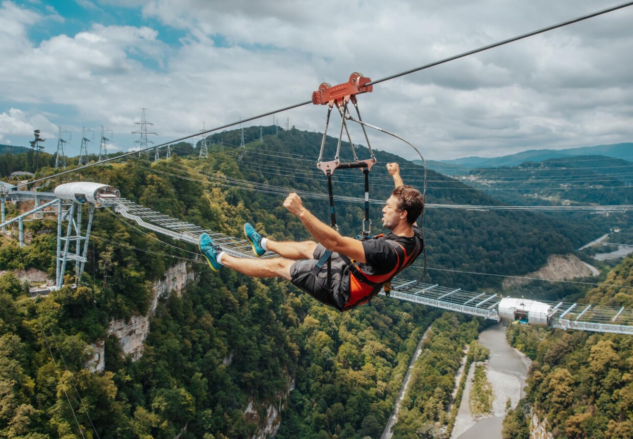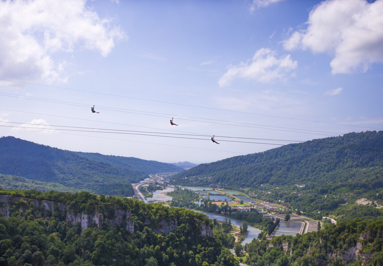Zipline – это самый доступный аттракцион в Скайпарке по порогу преодоления страха. Захватывающий дух полёт на троллее над Ахштырским ущельем со скоростью 60 км/час – это возможность почувствовать себя птицей, парящей в небе. 700 метров – именно такое расстояние вы пролетаете на одном дыхании от одной стороны ущелья до другой на высоте 330 метров над уровнем моря.